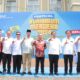 Bupati Sergai Darma Wijaya didampingi Ketua TP PKK Sergai Hj Rosmaida Darma Wijaya, Panitia Darmawan, Selamat Hartono, Camat Sipispis Herbin Damanik, Kepala Desa Bartong Heriandi Damanik saat melepas Latber Xtrim Sergai di Desa Bartong Kec.Sipispis, Minggu (7/7). Waspada/Edi Saputra