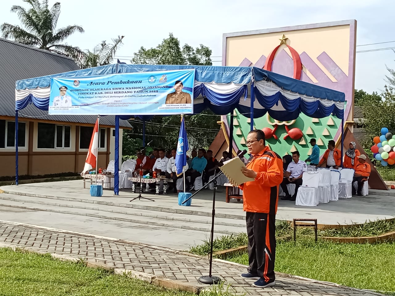 DELISERDANG (Waspada): Kepala Dinas pendidikan Kabupaten Deliserdang diwakili Sekretaris, Irwansyah M.Si membuka kegiatan Olimpiade Olahraga Siswa Nasional (O2SN) Sekolah Dasar (SD) tingkat Kabupaten Deliserdang tahun 2025 di Cadika Pramuka Lubukpakam, Rabu (14/5/25) sore.