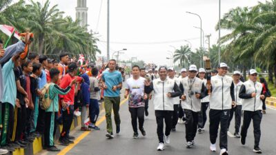 Bupati Darma Wijaya dan Wabup Adlin Tambunan membawa obor api PON secara bergantian didampingi Kapolres Sergai AKBP Jhon Sitepu, Kajari Sergai Rufina Ginting, Ketua DPRD Sergai Ilham Ritonga, Ketua PN Sei Rampah M Sacral Ritonga, Ketua TP PKK Ny Hj Rosmaida Saragih Darma Wijaya, Sekdakab Rusmiani Purba, sejumlah Asisten dan Kepala OPD, unsur Forkopimda lainnya dan masyarakat serta pelari kirab api PON XXI, Minggu (8/9).