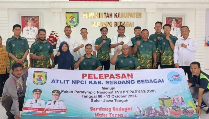 SEIRAMPAH (Waspada): Bupati Serdang Bedagai (Sergai) H. Darma Wijaya melepas 8 atlet National Paralympic Committee (NPC) Kab. Sergai untuk mengikuti ajang Pekan Paralimpiade Nasional (Peparnas) XVII di Solo, Jawa Tengah, Rabu (11/9) dari kantor Bupati Sergai di Sei Rampah.