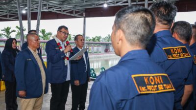 Ketua Umum KONI Deliserdang,dr Asri Ludin Tambunan (dua kiri) melantikan Pengurus KONI Kecamatan Percut Sei Tuan di Aula Kolam Pancing Pagar Pinang,Sabtu (18/5/24) sore. Waspada/Ist