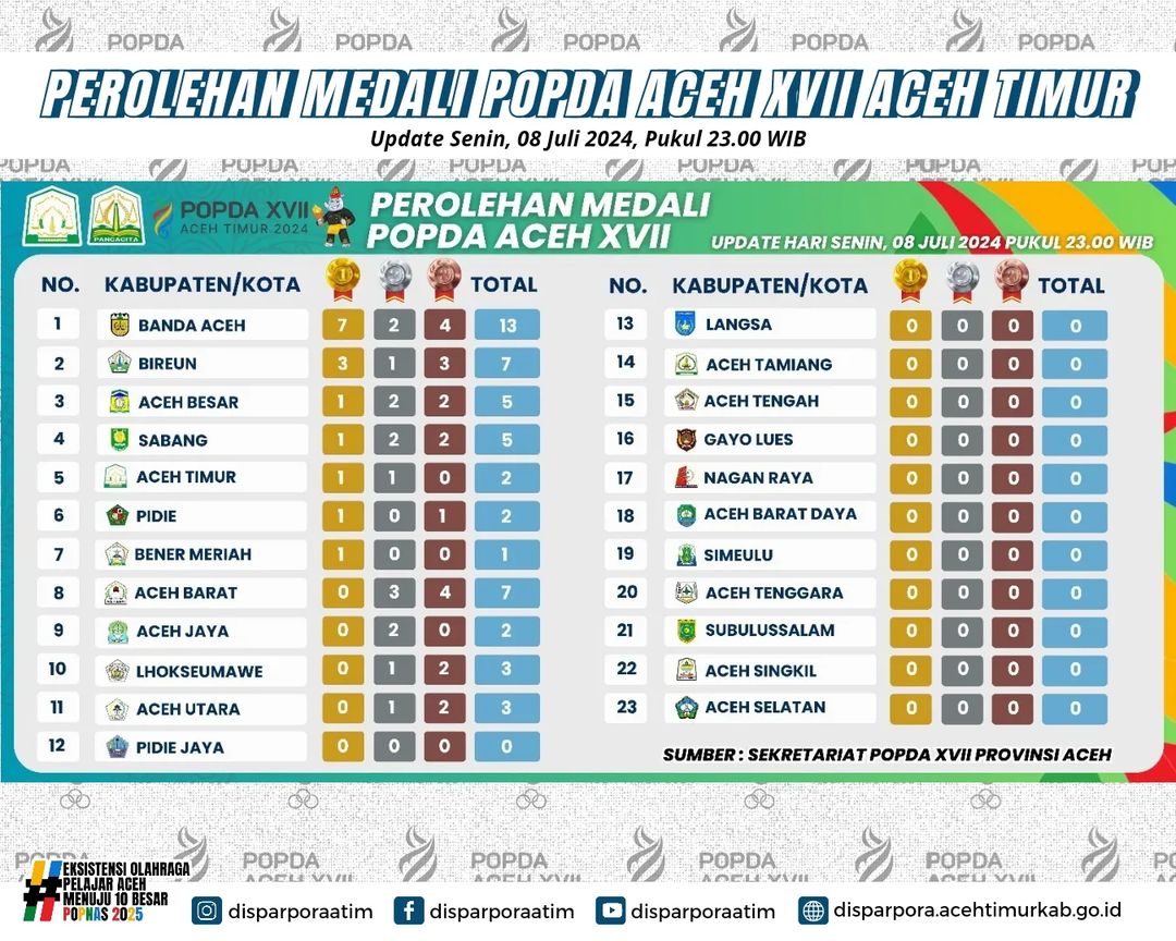 Perolehan medali tersebut diperoleh dari Sekretariat Popda XVII Provinsi Aceh, Senin (8/7) sekira pukul 23:00 Wib. Berbagai pertandingan dalam Popda XVII masih terus berlangsung hingga empat hari kedepan, termasuk cabor sepakbola yang kini telah memasuki putaran kedua delapan besar.
