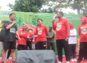 Bupati Sergai Darma Wijaya berlari membawa obor api PON XXI didampingi Wabup H Adlin Tambunan dan unsur Forkopimda, bersama pasukan kirab obor api PON XXI Aceh-Sumut meninggalkan Alun-alun Sergai menuju Kab.Deli Serdang disaksikan belasan ribu masyarakat, ASN dan pelajar, Minggu (8/9) baru-baru ini. Waspada/Edi Saputra