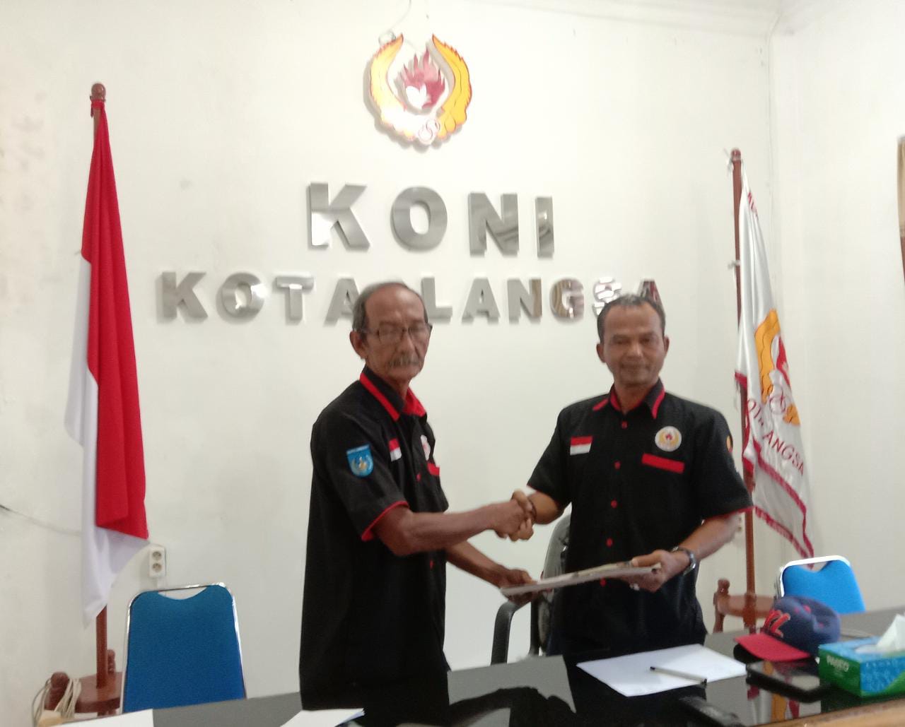Ketua Tim Kontingen Kota Langsa Zulhari Abdulah menyerahkan data atlet Pora Kota Langsa kepada Ketua KONI Langsa melalui Ketua Harian Karnaini SPd, Rabu (2/11). Waspada/Munawar