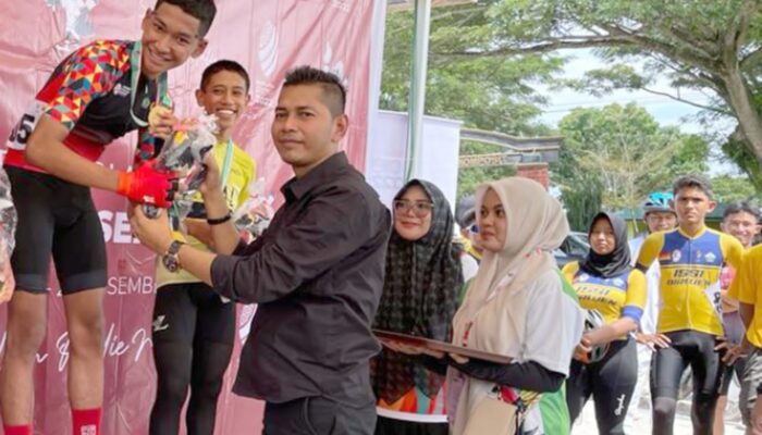 Ketua Ikatan Sport Sepeda Indonesia (ISSI) Kabupaten Pidie Muhammad SPdI menyerahkan maskot Pora XIV kepada pebalap tuan ruma Pidie Rizki Ananda Putra, Sabtu (17/12) Waspada/Ist