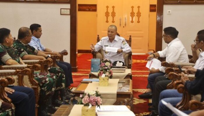 Pj Gubernur Aceh, Achmad Marzuki didampingi Kadispora Aceh Dedy Yuswadi dan Ketua KONI Aceh Kamaruddin Abubakar, saat menerima kunjungan Ketua Harian PB FASI Marsda TNI Andi Wijaya beserta rombongan di Meuligoe Gubernur Aceh, Banda Aceh, Kamis (30/3). Waspada/Zafrullah