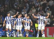 Para pemain Real Sociedad merayakan keberhasilan Goncalo Guedes mencetak gol ke gawang Barcelona pada pertandingan Liga Spanyol di Stadion Anoeta, San Sebastian, Minggu (18/1/2026) waktu setempat. laliga.com