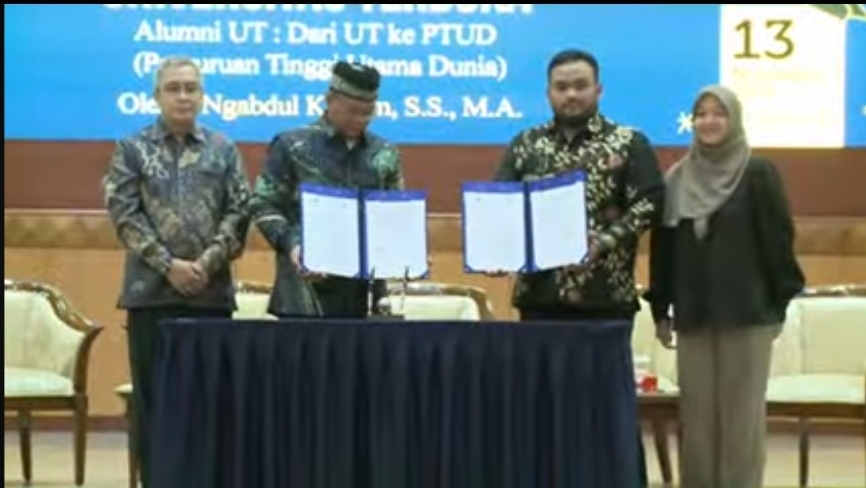 Penandatanganan dilakukan Rektor UT, Prof. Ojat Darojat, M.Bus., Ph.D. dam Ketua PPID Hamzah Assudy Lubis di tengah kegiatan seminar Wisuda UT