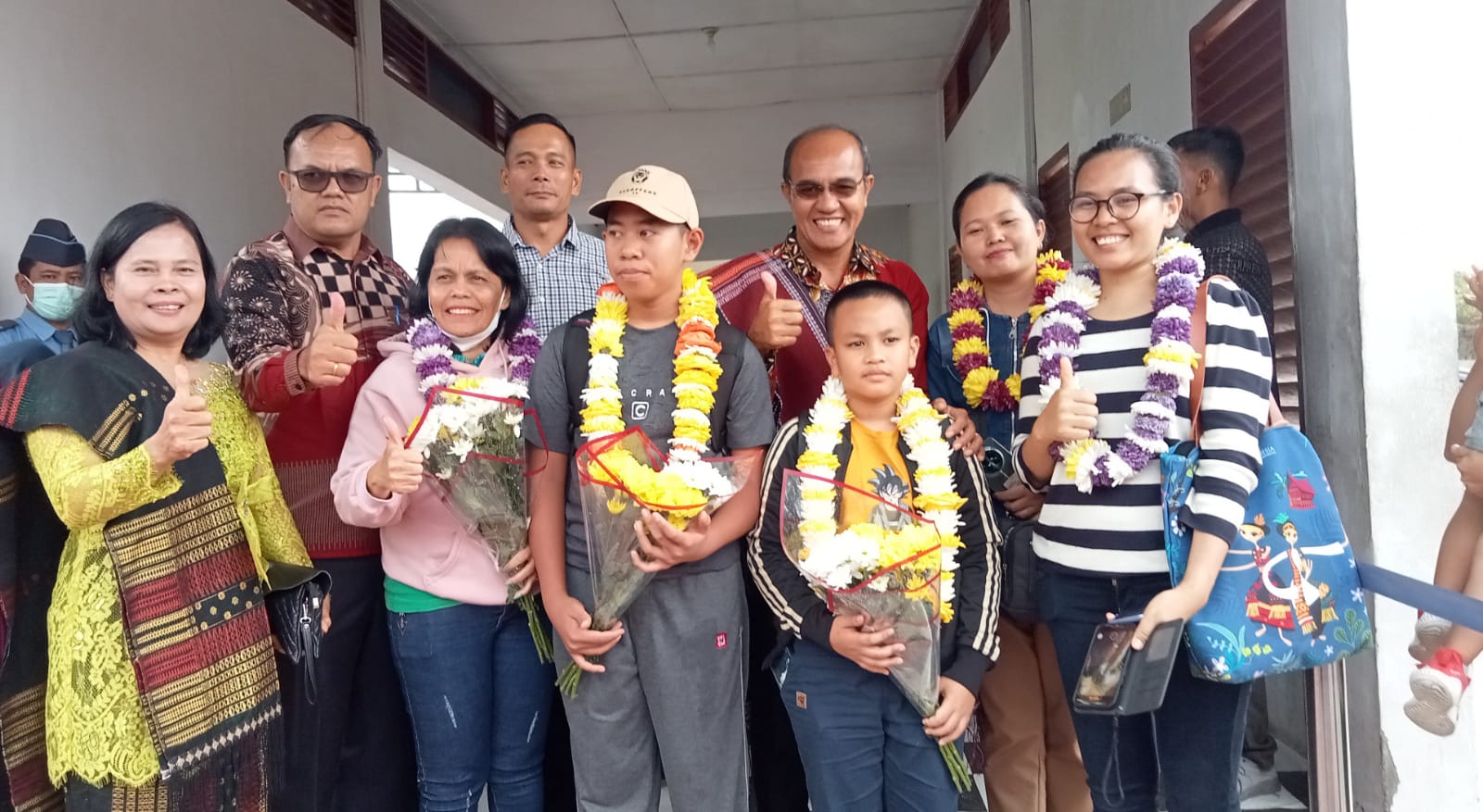 TOBA (Waspada) : Kadis Pendidikan Pemuda dan Olahraga (Kadisdikpora) Kabupaten Toba, Rikardo Hutajulu bersama Kabid Dikdas Lamhot Sitorus dan Kabid Paud/Dikmas, Lamhot Mauli Simanjuntak menyambut langsung kedatangan dua siswa berprestasi peraih medali perak pada Olympiade Sains Nasional (OSN) Tingkat Nasional di Bandara Silangit, Minggu (11/8).