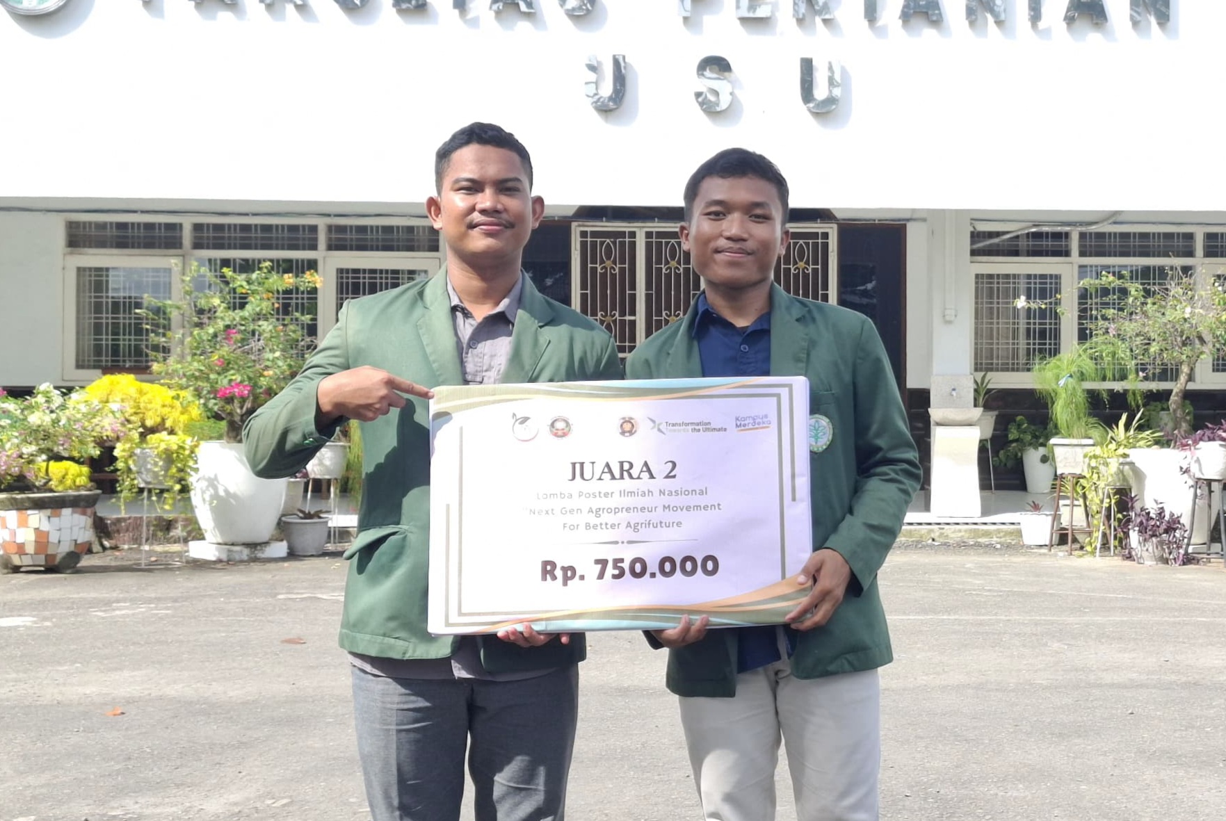 MEDAN (Waspada): Dua mahasiswa Politeknik Pembangunan Pertanian (Polbangtan) Medan dari prodi Penyuluhan Pertanian Berkelanjutan (PPB), Juli Pria Setia sebagai ketua tim dan Sugit Pujiono sebagai anggota tim berhasil meraih juara 2 lomba poster ilmiah tingkat nasional dengan tema ‘Next gen agropreneur movement for better agriculture” di Fakultas Pertanian Universitas Sumatera Utara, Jumat (6/12).