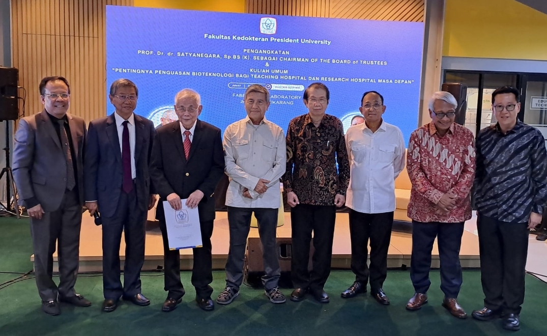 JAKARTA (Waspada): President University secara resmi mengangkat Prof. Dr. dr. Satyanegara Sp.BS (K), seorang ahli bedah saraf terkemuka, sebagai Chairman of the Board of Trustees atau Ketua Wali Amanat Fakultas Kedokteran. Prosesi pengangkatan dilakukan di Fabrication Laboratorium (Fablab), President University Convention Center (PUCC), Kota Jababeka, Cikarang, Bekasi, Jumat (1/3/2024).