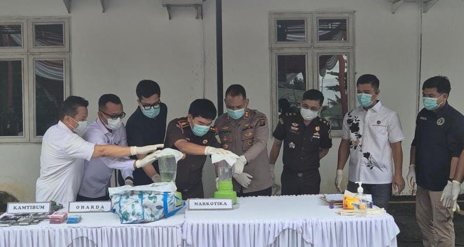 Kajari Sergai Amriyata SH MH melakukan pemusnahan barang bukti narkoba jenis sabu 200 gram dan pil ekstasi dengan menggunakan blender berisi air.Waspada.id/Bambang