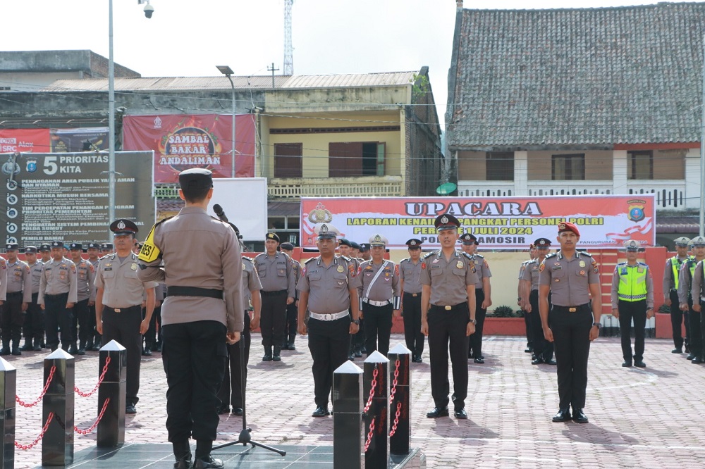 SAMOSIR (Waspada): Dalam upacara Korps Raport, 15 personel Polres Samosir resmi dinaikkan pangkat setingkat lebih tinggi dari sebelumnya, Selasa (2/7) di Lapangan Mapolres Samosir.