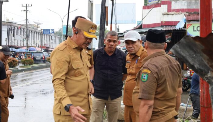 PANYABUNGAN (Waspada.id): Bupati Mandailing Natal (Madina) H. Saipullah Nasution, SH.MM, meninjau langsung drainase tersumbat di kawasan Pasar Lama, Kelurahan Panyabungan III, Kecamatan Panyabungan, Selasa (30/12). Drainase yang kerap meluap saat hujan menyebabkan genangan yang mengganggu aktivitas masyarakat dan lalu lintas.