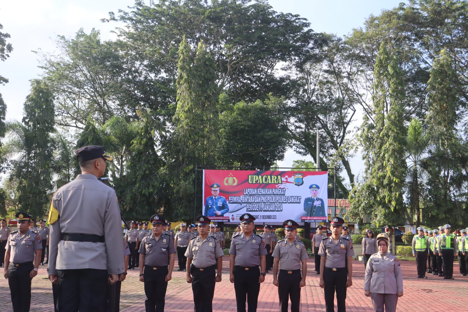 Upacara Kenaikan Pangkat Perwira, Bintara, PNS Polri Jajaran Polres Langkat di Lapangan Jananuraga Polres Langkat , Minggu (31/12/2023). Waspada/ist