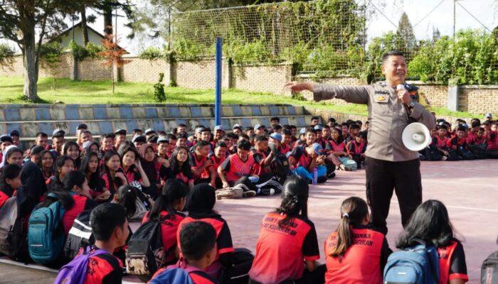 KARO (Waspada): Mengantisipasi munculnya pelaku geng motor yang kerap dinilai mengganggu katimbas masyarakat, personel Polsek Simpang Empat Polres Tanah Karo melakukan sosialisasi ke sekolah sekolah, Sabtu (14/7) di SMK Negeri 1 Desa. Merdeka Kec. Simpang Empat.