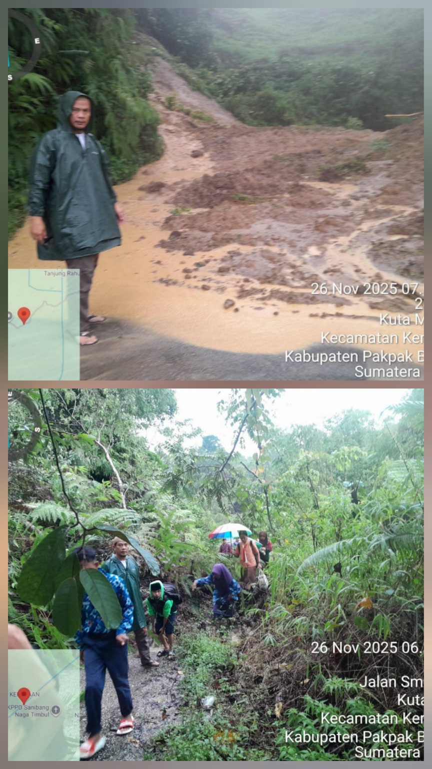 Kepala Pelaksana BPBD Pakpak Bharat, Augusman Harapan Padang, Rabu (26/11/2025) menjelaskan bahwa tim BPBD bersama TNI dan Polri sedang berupaya menangani longsor di beberapa lokasi. “Untuk saat ini akses menuju dan dari Kabupaten Pakpak Bharat terputus total. Longsor terjadi di sejumlah titik di ruas Pakpak Bharat-Dairi, baik melalui Delleng Lumut, Kuta Dame, maupun Kuta Jungak,” ujarnya.