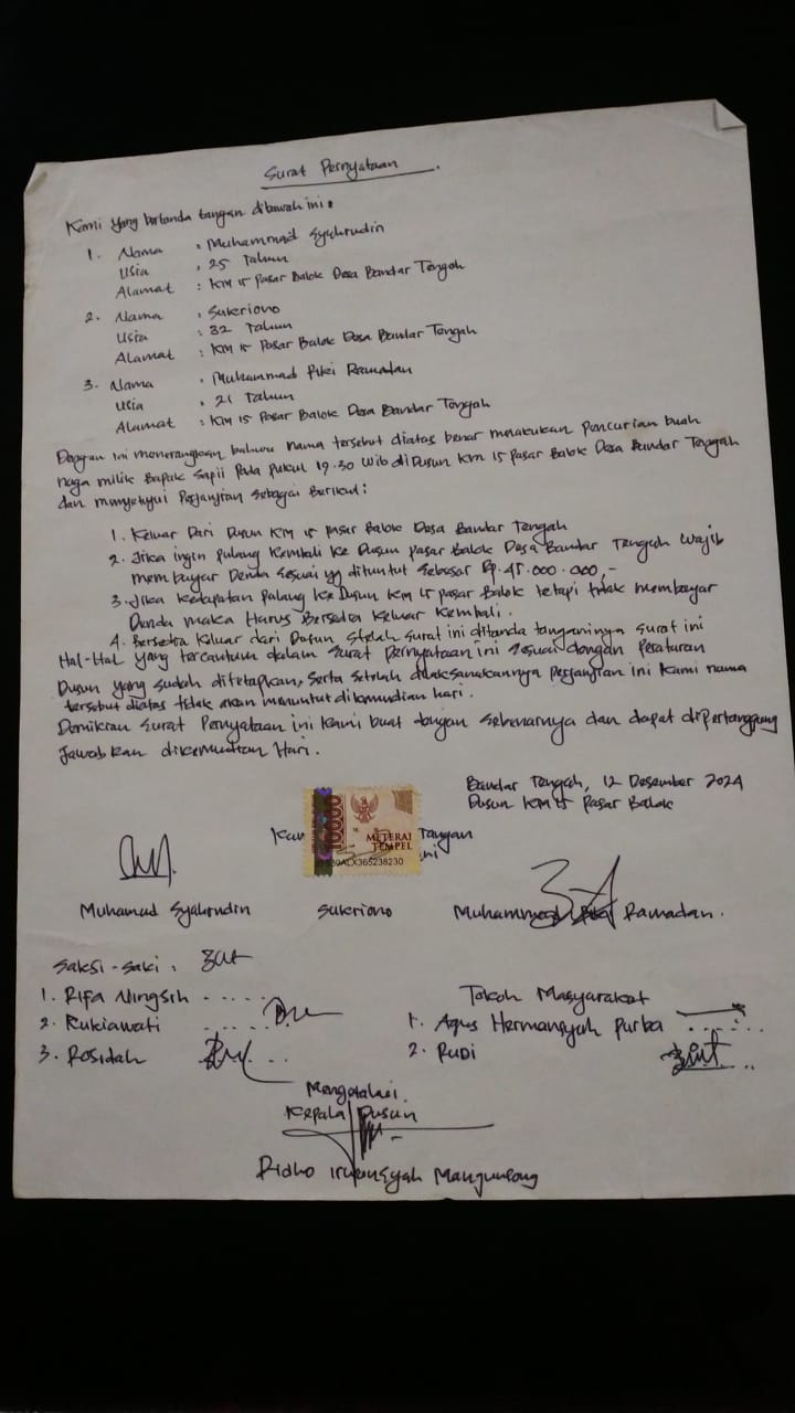 Para pelaku lalu dibawa ke rumah tokoh masyarakat, Agus Purba, yang juga anggota Tim Peraturan Dusun (Perdus). Di sana para pelaku mengakui pencurian, sesuai hasil musyawarah terduga pelaku dan pemilik kebun sepakat menandatangani surat perdamaian dan kesepakatan denda Perdus sebesar Rp45 juta yang disaksikan kepala dusun, tokoh masyarakat, dan keluarga pelaku.