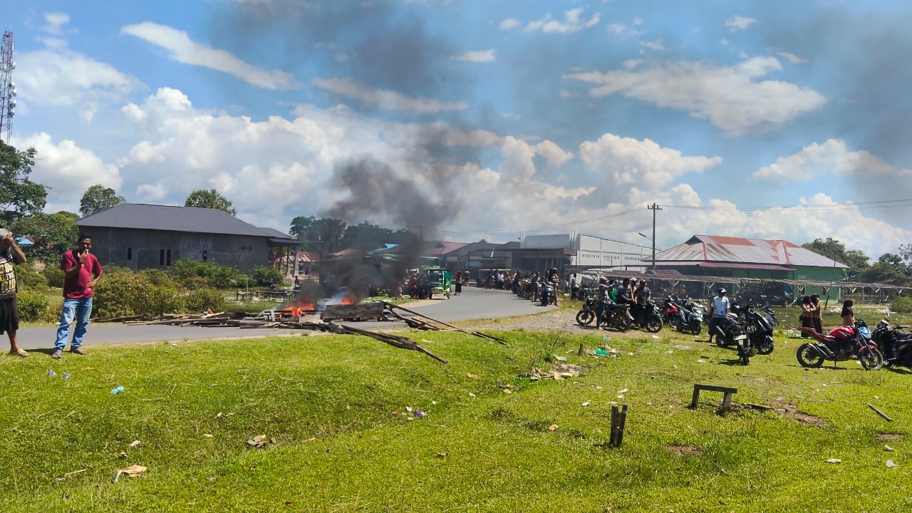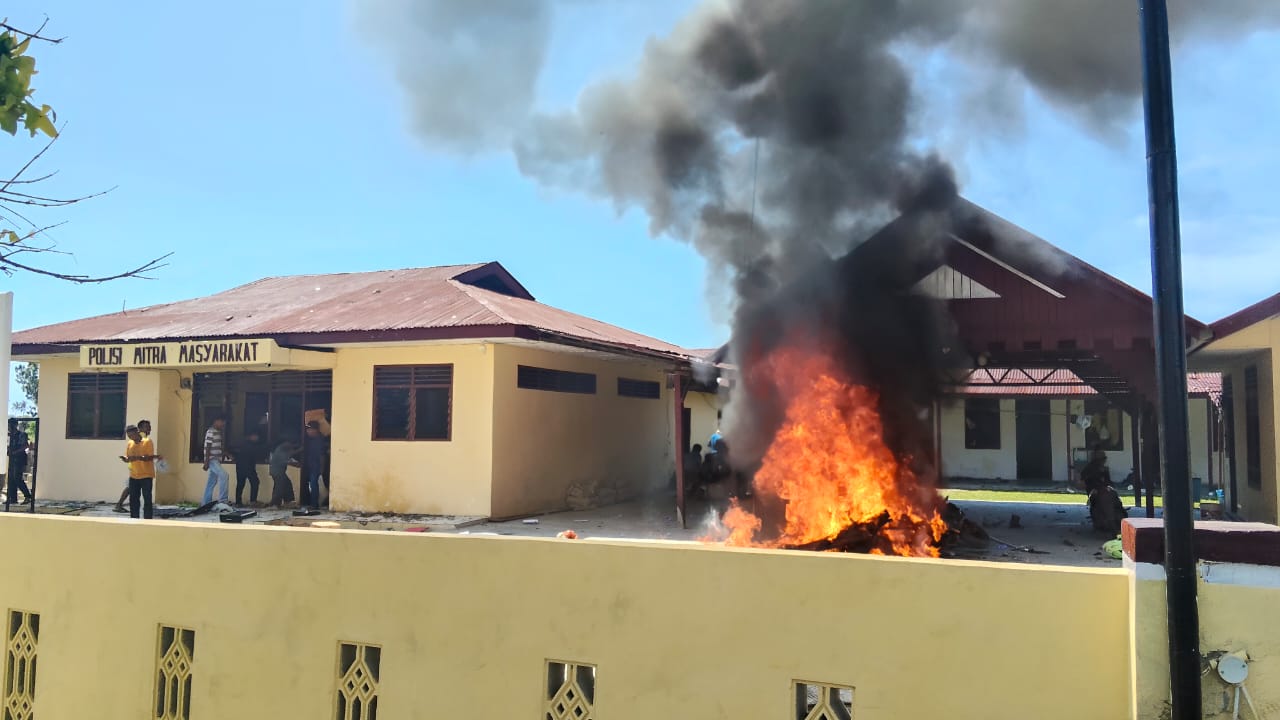 Aksi protes tersebut berujung pada ketegangan dan perusakan, di mana massa sempat menggulingkan mobil dinas Polsek MBG yang terparkir di depan kantor.