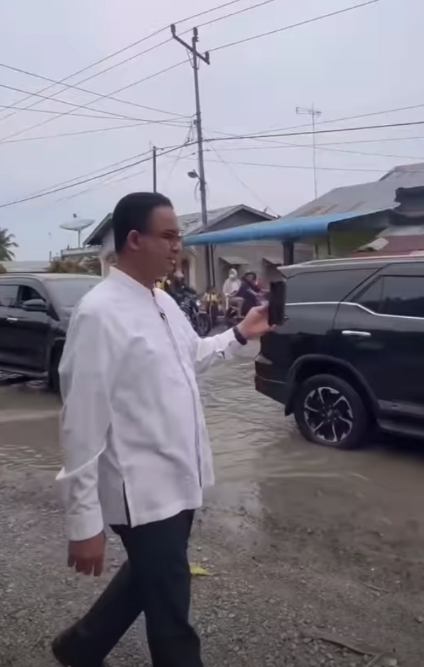 Dengan senyum khasnya, Anies menyambut harapan warga dan mengatakan akan menjadi perhatiannya. Anies juga mengabadikan jalan rusak itu menggunakan HP-nya untuk dokumentasi pribadinya.