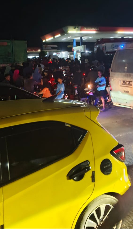 Ratusan kenderaan bermotor berjejal di jalan masuk SPBU. Antrean panjang ini tumpah hingga sampai ke jalan raya sehingga menimbulkan kemacetan cukup parah di ruas jalan nasional yang menghubungi Medan – Aceh.