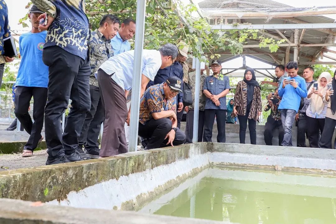 BERINGIN (Waspada.id): Bupati Deliserdang, dr. Asri Ludin Tambunan meninjau perkebunan anggur dan budidaya ikan hias milik Sukirno di Dusun Cempaka Desa Beringin pada rangkaian kunjungan kerja Bupati Bekerja Bertemu Rakyat (Berjemur) di Kecamatan Beringin, Kamis (30/10/25).