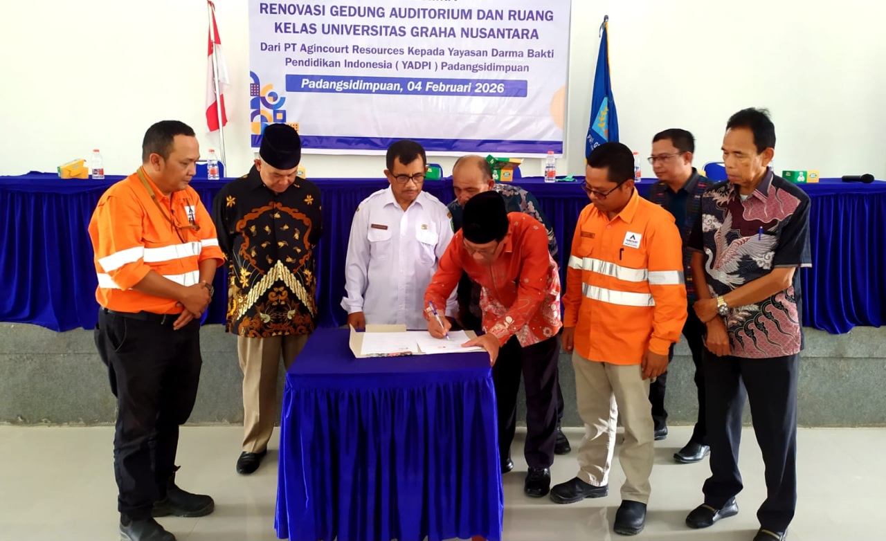 PADANGSIDIMPUAN (Waspada.id): Gedung Auditorium dan ruang kelas Universitas Graha Nusantara Padangsidimpuan (UGNP) Kampus 1 Tor Simarsayang yang direnovasi dengan bantuan PT Agincourt Resources (AR) diresmikan pada Rabu (04/02/2026), dengan penandatanganan berita acara serah terima kepada Yayasan Dharma Bhakti Pendidikan Indonesia (YADPI).