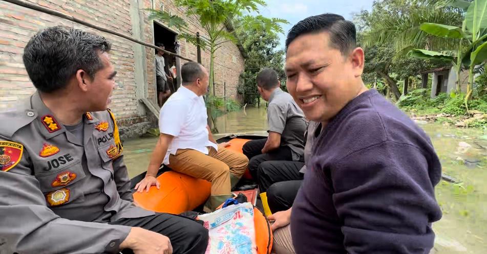 Termasuk Bupati Zahir, bersama Kapolres AKBP Jose DC Fernandes, S.I.K, Ketua Kadin OK.Faizal turun menyelusuri banjir menggunakan perahu karet.