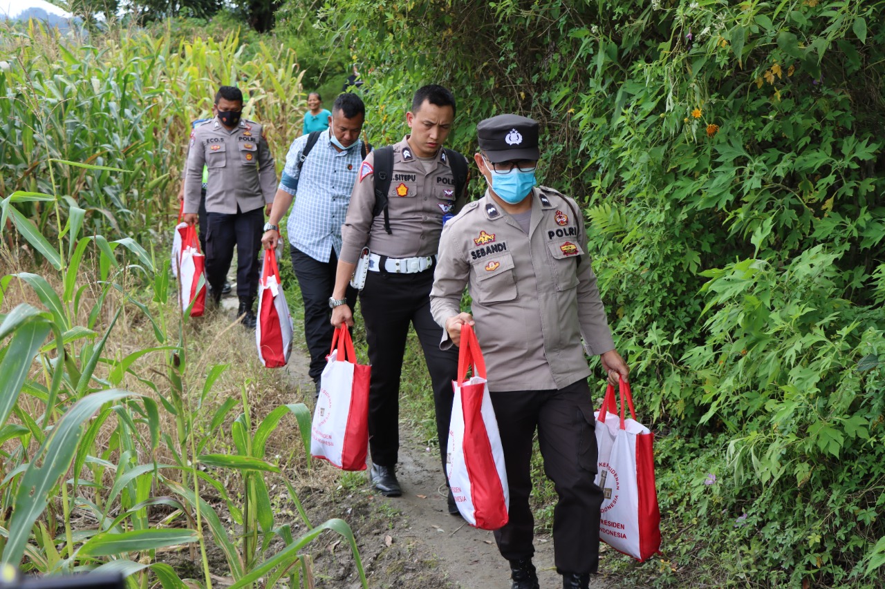 TAPUT (Waspada.Id) : Para Bhabinkamtibmas sejajaran Polres Tapanuli Utara mengantarkan bantuan sosial berupa kebutuhan bahan pokok dari Presiden RI dan Kapolri ke rumah masing masing warga, Senin (7/11).