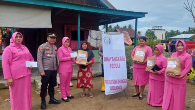 Penyerahan bantuan berdasarkan arahan Ketua Bhayangkari Cabang Kab. Mandailing Natal Ny Rina Reza Chairul Akbar Sidiq. Batuan berisi gula, susu, susu bayi, kain untuk shalat, popok bayi, biskuit dan makanan formula untuk bayi.