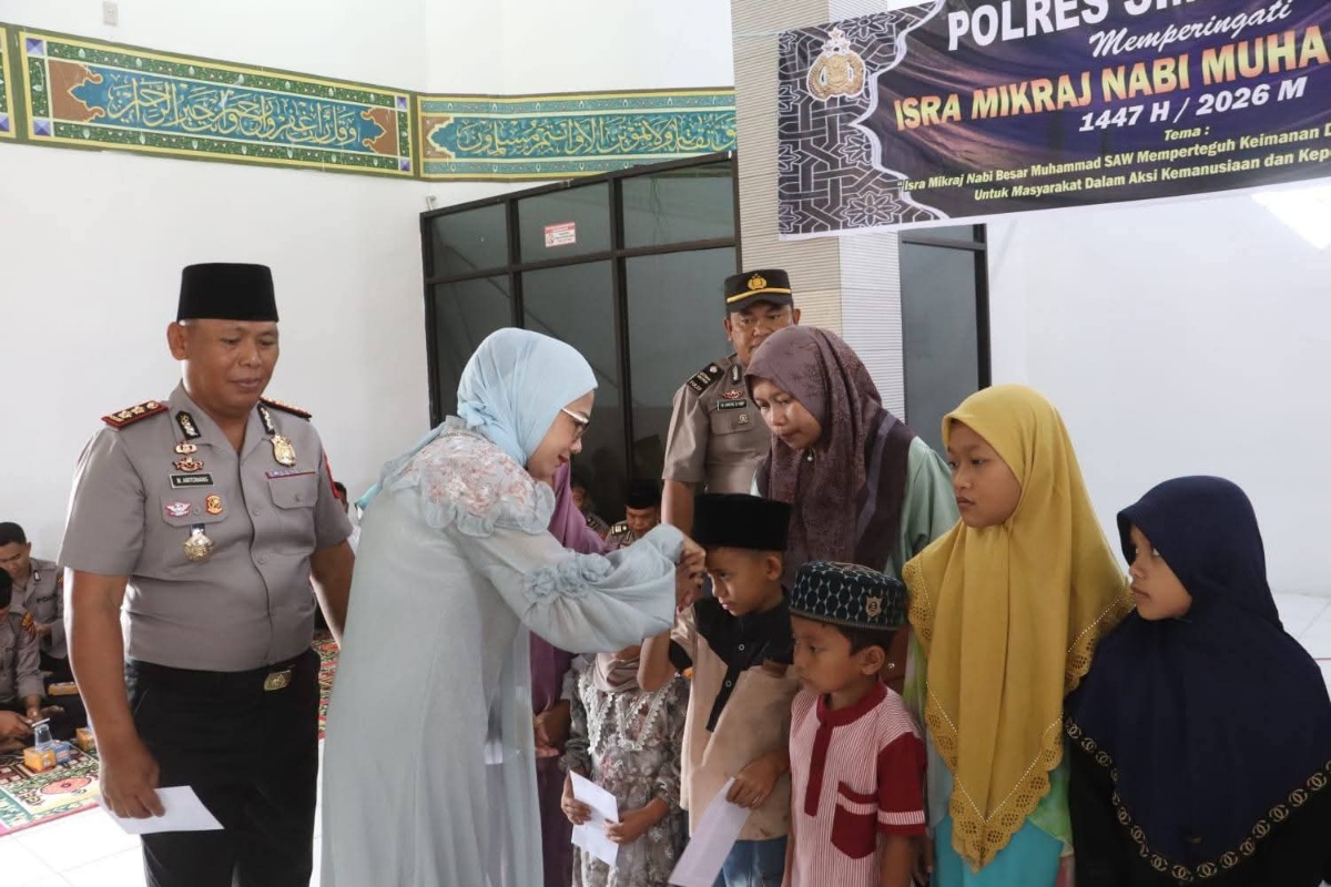 SIMALUNGUN (Waspada.id): Ketua Bhayangkari Cabang Simalungun Ny. Nanik M. Aritonang bersama Kapolres Simalungun AKBP Marganda Aritonang SH SIK MM menggelar peringatan Isra Mikraj Nabi Muhammad SAW 1447 Hijriah di Masjid Nur Hidayah Mapolres Simalungun, Rabu (28/1/2026). Dalam momentum tersebut, Bhayangkari wujudkan program Bhayangkari Peduli melalui penyerahan santunan kepada kaum dhuafa, anak yatim, dan piatu di sekitar Mapolres Simalungun.