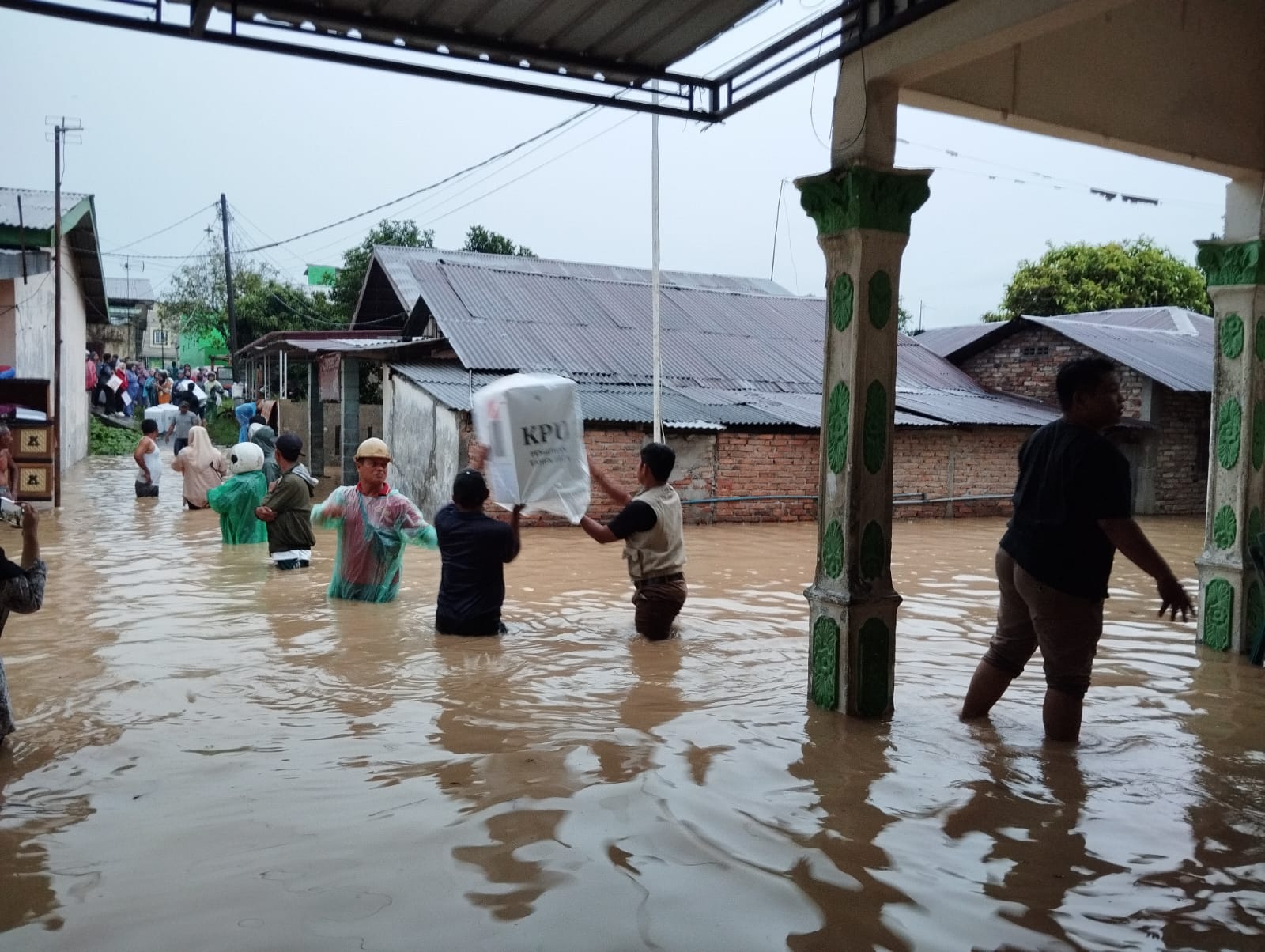 Akibat banjir yang tak kunjung surut, jam pemungutan dan penghitungan suara (Putungsura) Pilkada Binjai diundur untuk beberapa kelurahan.