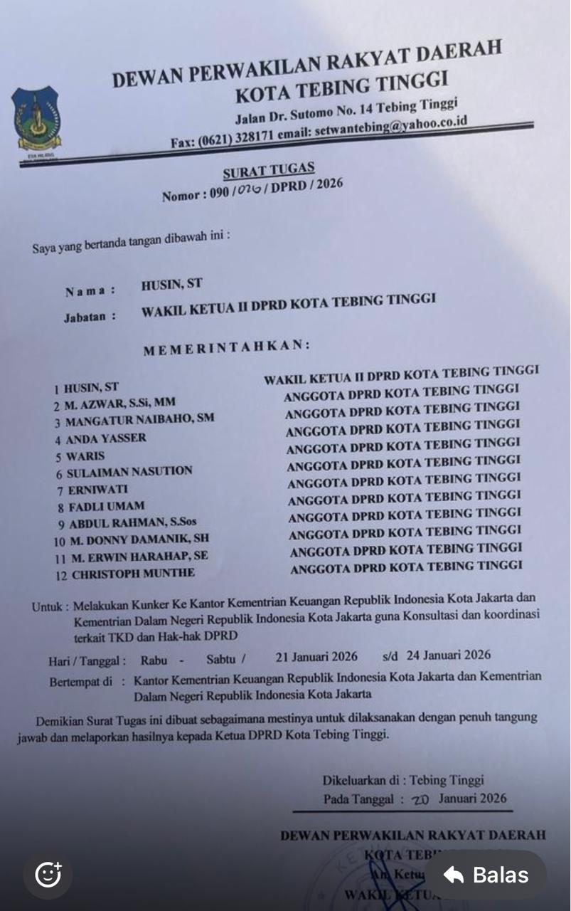 Persoalan antara Ketua DPRD dan 9 anggota DPRD bermula ketika keluar surat perintah No. 090/020/DPRD/2026 tanggal 20 Januari 2026 kepada 12 anggota Dewan untuk melakukan kunker ke Jakarta.