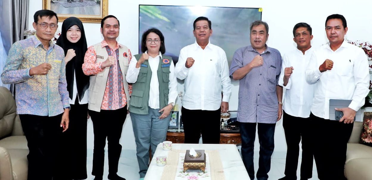 SIMALUNGUN (Waspada): Bupati Simalungun Radiapoh Hasiholan Sinaga didampingi Kepala Badan Penanggulangan Bencana Daerah (BPBD) Resman Saragih menerima kunjungan Kepala Subdirektorat Perencanaan Pendanaan Badan Nasional Penanggulangan Bencana (BNPB) Pusat Priska Saragih.