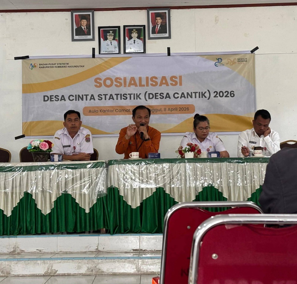 DOLOKSANGGUL (Waspada.id): Badan Pusat Statistik (BPS) Kabupaten Humbang Hasundutan menyosialisasikan Program Desa Cinta Statistik (Desa Cantik) di Aula Kantor Camat Doloksanggul, Rabu (8/4/2026). Terdapat tiga desa yang ditetapkan sebagai lokus tahun ini, yakni Desa Sirisirisi, Saitnihuta, dan Lumban Tobing.