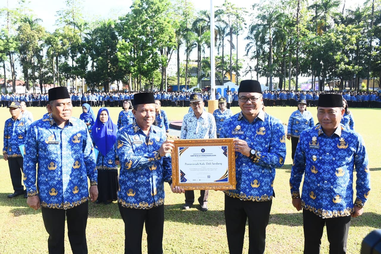 Upacara tersebut juga dirangkai dengan penyerahan Surat Keputusan (SK) pensiun dan dana sosial Korpri kepada 22 ASN, serta penyerahan sertifikat penghargaan dari Kepala Badan Kepegawaian Negara RI kepada Pemkab Deliserdang atas penyelesaian proses pengadaan Calon Aparatur Sipil Negara (CASN) Tahun Anggaran 2024 terbaik secara zoom meeting yang berlangsubg pada Rabu, 16 April 2025, diterima Bupati bersama Wakil Bupati Deliserdang.(rin)