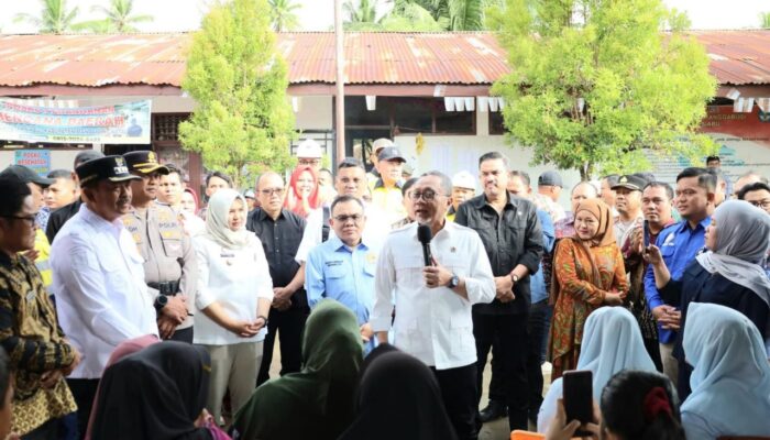 SIABU (Waspada.id): Bupati Mandailing Natal (Madina) H. Saipullah Nasution dan Wakil Bupati Atika Azmi Utammi Nasution mendampingi Menteri Koordinator Pangan Zulkifli Hasan dan Menteri UMKM Maman Abdurrahman menyalurkan bantuan bagi warga terdampak bencana banjir yang mengungsi di SDN 037 Tanggabosi, Kecamatan Siabu, Kamis (4/12/2025).