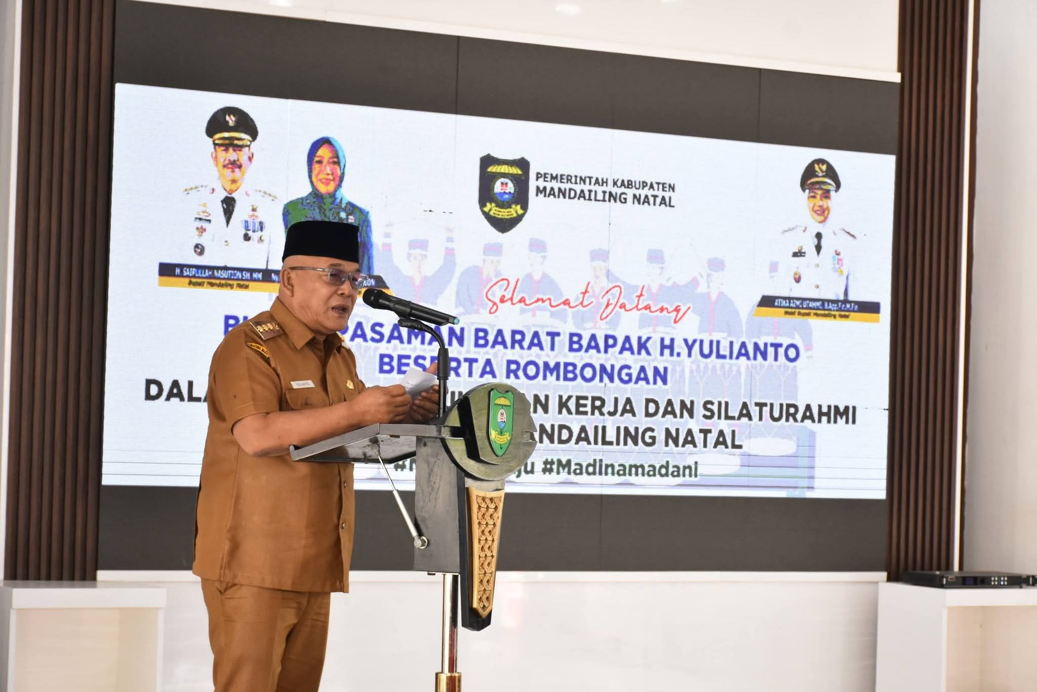 PANYABUNGAN (Waspada.id): Bupati Mandailing Natal (Madina) H. Saipullah Nasution menerima kunjungan kerja Bupati Pasaman Barat, Sumatera Barat, Yulianto dan rombongan di Rumah Dinas Bupati, Desa Parbangunan, Panyabungan, pada Selasa (27/1/26).