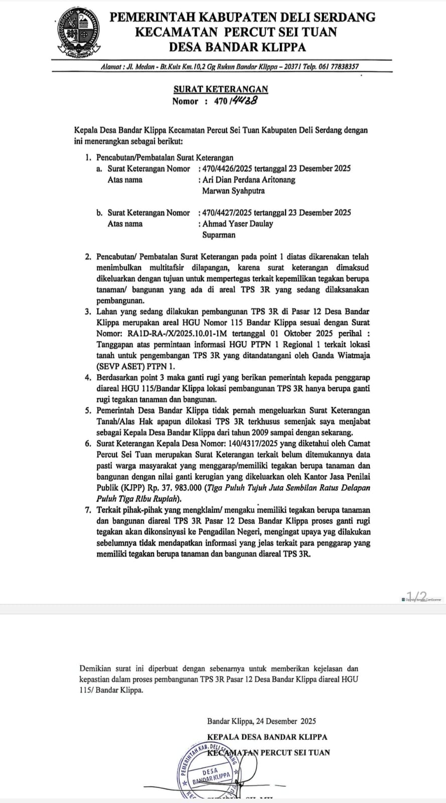 PERCUTSEITUAN (Waspada.id): Kepala Desa (Kades) Bandar Klippa, Suripno, mencabut atau membatalkan surat keterangan Nomor 470/4426/2025 tertanggal 23 Desember 2025 dan Nomor 470/4427/2025, tertanggal 23 Desember 2025.