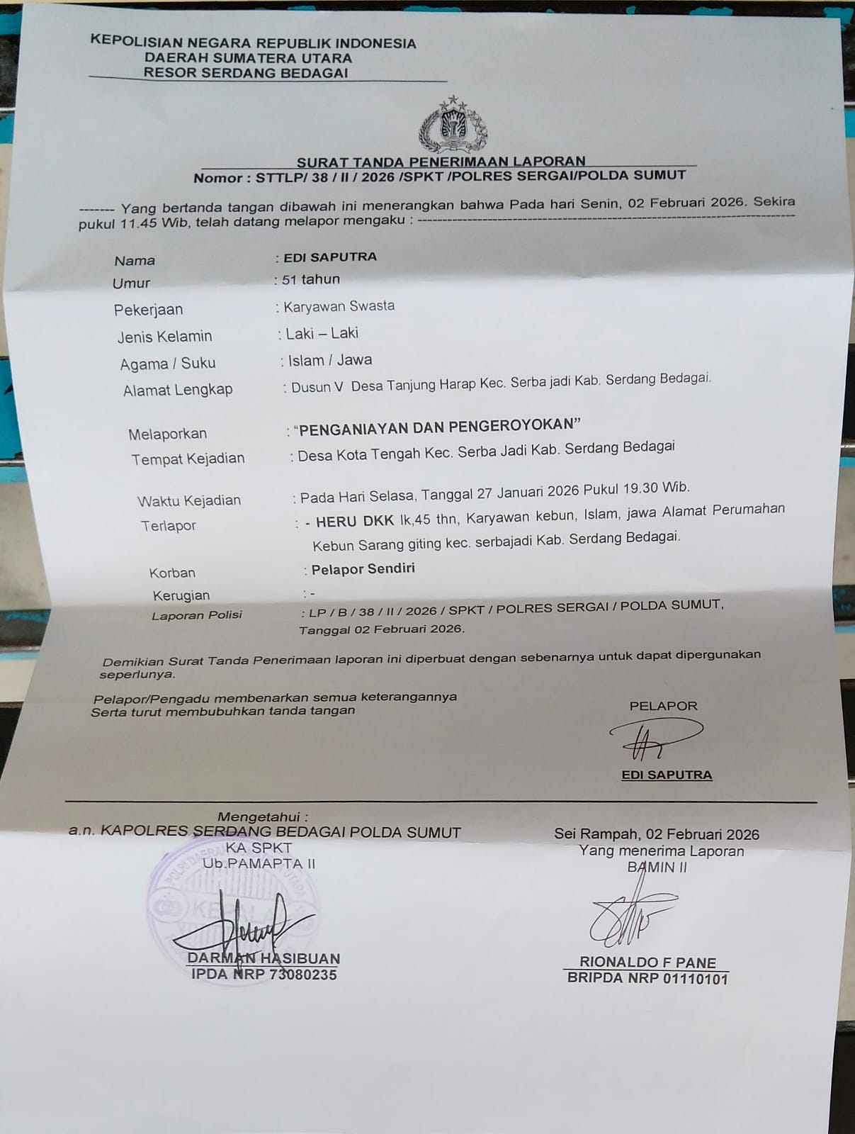 Laporan korban teregister dalam Surat Tanda Penerimaan Laporan (STTLP) Nomor: STTPL/38/II/2026/SPKT/Polres Sergai/Polda Sumut. Dalam laporannya, Edi menyebut dirinya diduga menjadi korban kekerasan oleh inisial H, seorang karyawan, serta dua oknum petugas keamanan PTPN IV Regional I Kebun Sarang Giting.