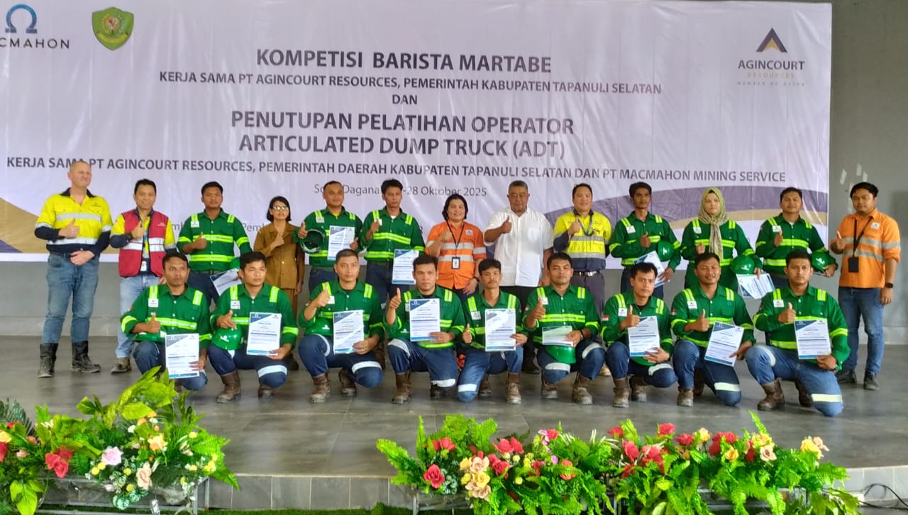 Pengumuman pemenang kompetisi Barista Martabe 2025 yang dirangkai dengan Penutupan Pelatihan Operator Articulated Dump Truck (ADT) kerjasama PT AR, Pemkab Tapsel dan PT Macmahon Mining Service dihadiri Kelala Dinas Ketenagakerjaan Tapsel Ahmad Raja Nasition.