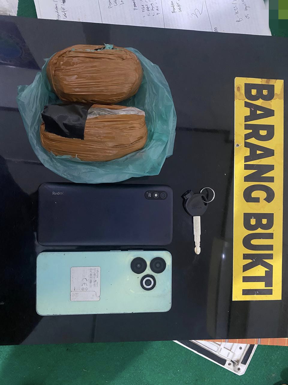 Dari Abdul, petugas menemukan satu plastik hijau berisi dua bal ganja, satu unit handphone, dan sepeda motor tanpa plat nomor.