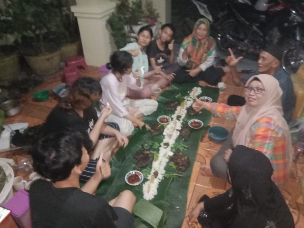 Dua sepupu ini disuapi sang nenek Hj Dj. Wardah, orangtua dan kerabat. Mereka main game membuat suasana makin meriah menjelang tahun baru. Kemudian, mereka makan bersama di atas daun dengan ikan yang barusan selesai dibakar. Maknyos…!