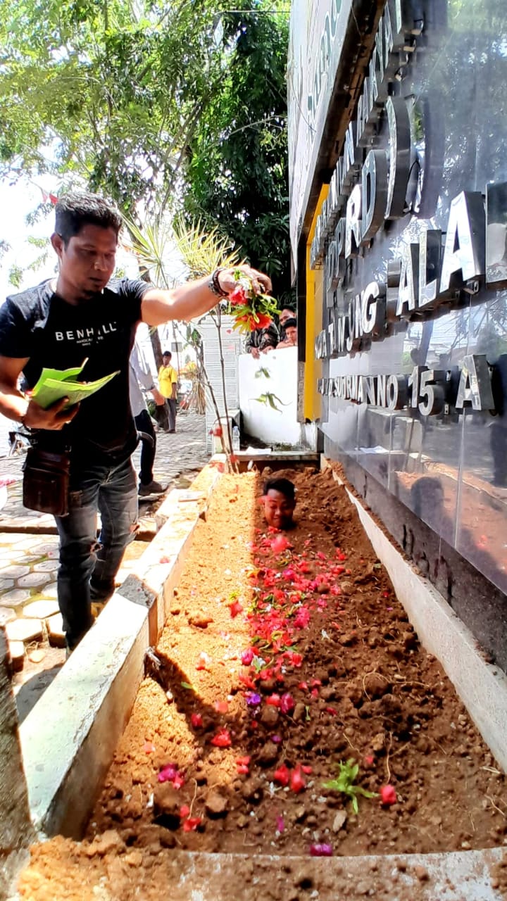 Beberapa teman kemudian menggali lubang tepat berada di bawah tulisan Dewan Perwakilan Rakyat Kota Tanjungbalai. Kacak selanjutnya masuk ke dalam lubang lalu dengan posisi berbaring ditimbun menggunakan bekas tanah galian mirip kuburan.