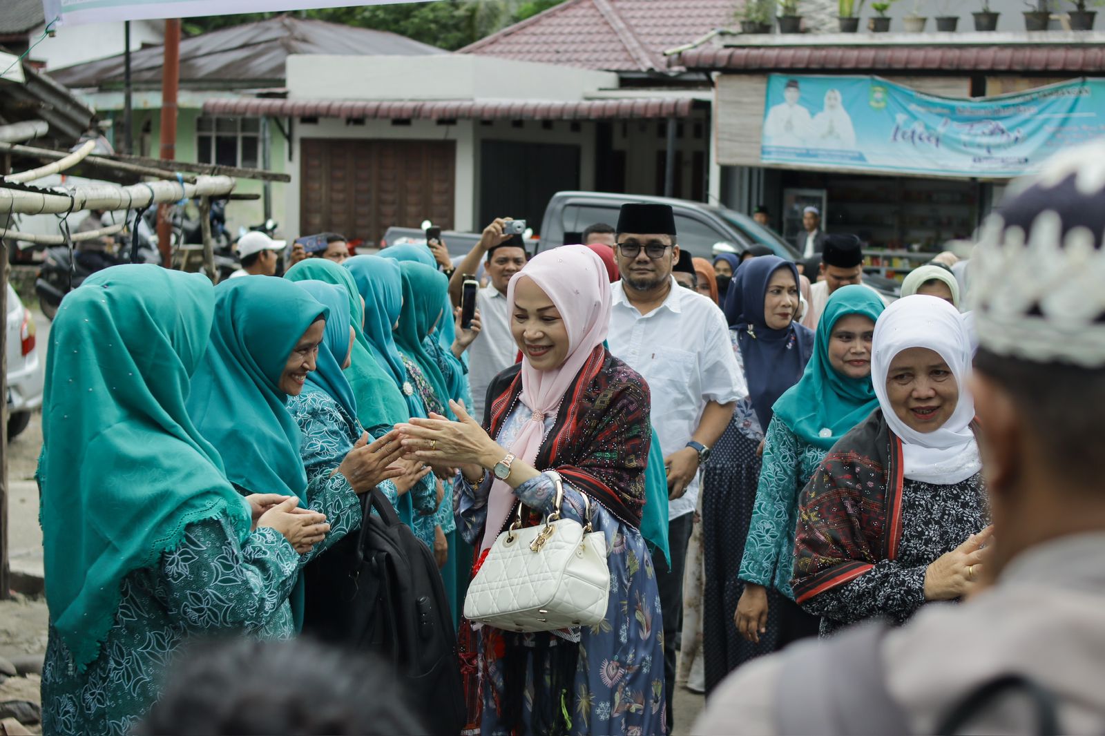 MADINA (Waspada): Ketua Tim Penggerak Pemberdayaan dan Kesejahteraan Keluarga (TP PKK) Kab. Mandailing Natal Eli Mahrani HM. Jafar Sukhairi Nasution menghadiri tablig akbar di balerong Desa Pasarlaru, Kec. Tambangan, Madina, Jumat (10/11).