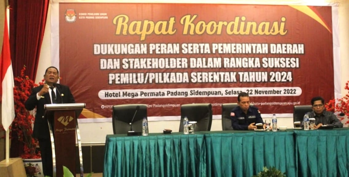 Dukungan terhadap kesuksesan Pemilu serentak Tahun 2024 tersebut diungkapkan unsur Forkopimda dan stakeholder dalam Rapat Koordinasi Dukungan Peran Serta Pemerintah Daerah dan Stakeholder Dalam Rangka Suksesi Pemilu/Pemilukada Tahun 2024 yang digelar KPU Padang Sidempuan di Aula Mega Permata Hotel, Padang Sidempuan, Selasa (22/11).
