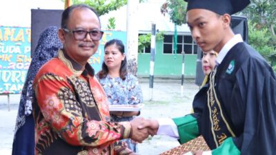 Wabup Simalungun, H.Zonny Waldi (kiri) memberi ucapan selamat kepada salah satu siswa SMP/SMK Tapen yang diwisuda, Sabtu (20/5). Waspada/ist