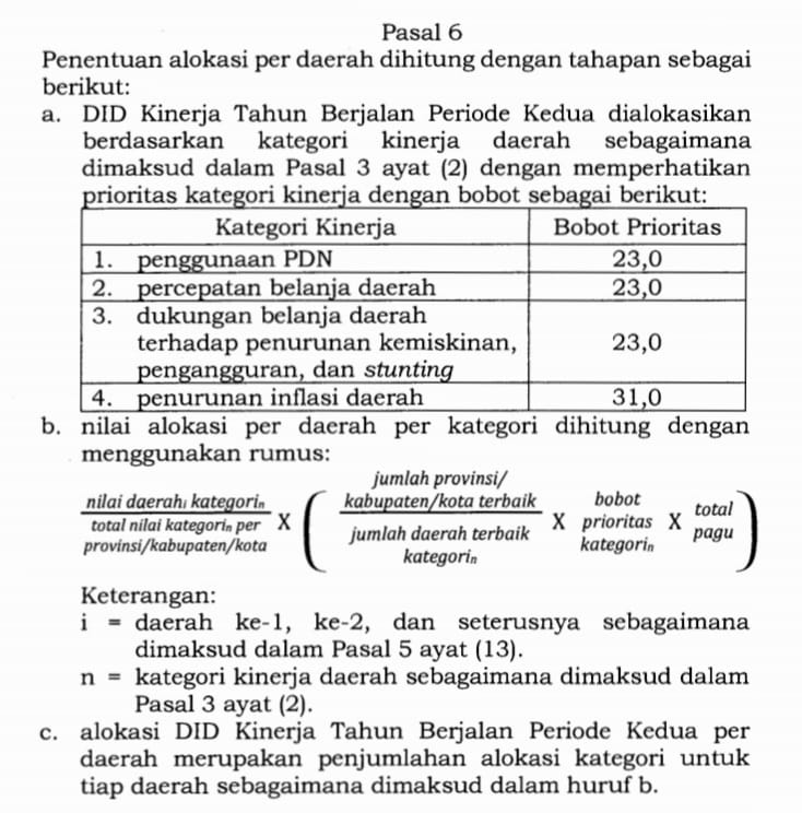 Di Pasal 2 Permenkeu itu disebutkan bahwa DID Kinerja Tahun Berjalan Periode Kedua dialokasikan sebesar Rp1.500.000.000.0000. Di Pasal 3 ayat (1) Permenkeu itu dijelaskan bawah Pengalokasian DID Kinerja Tahun Berjalan Periode Kedua dihitung berdasarkan kinerja daerah.