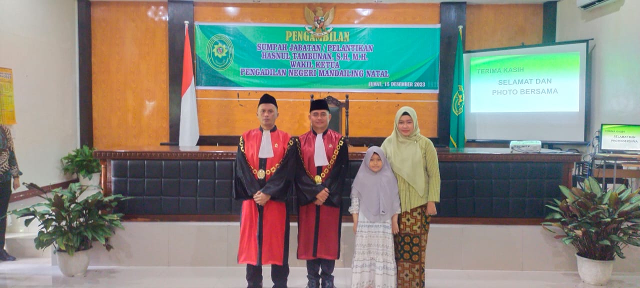 MADINA (Waspada): Hasnul Tambunan, SH, MH resmi dilantik dan diambil sumpahnya menjadi Wakil Ketua oleh Ketua Pengadilan Negeri ( PN) Mandailing Natal Arief Yudiarto SH, MH, Jum’at (15/12).
