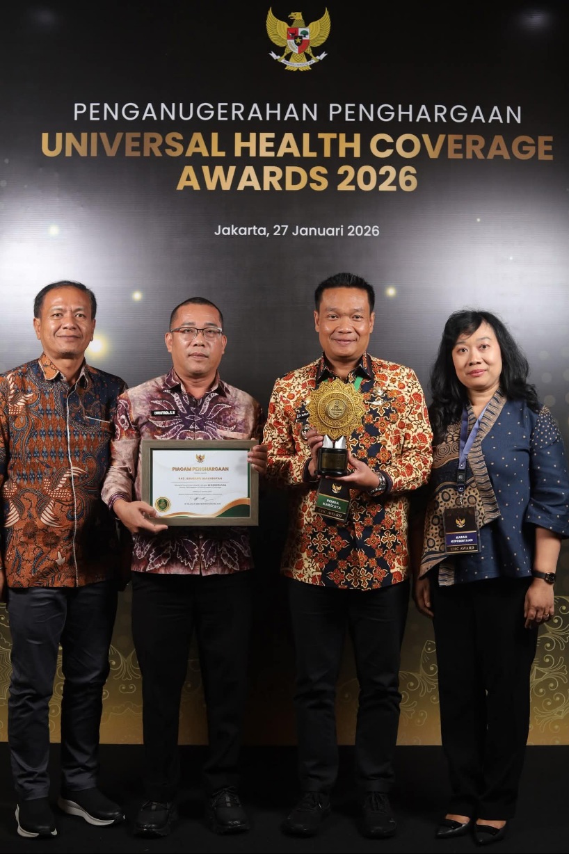 Penghargaan dari BPJS Kesehatan diserahkan oleh Menko Bidang Pemberdayaan Masyarakat RI Muhaimin Iskandar pada acara Deklarasi dan Pencanangan UHC serta Penghargaan Pemerintah Daerah Tahun 2026 di JIExpo Kemayoran Jakarta, Selasa (27/1/2026).